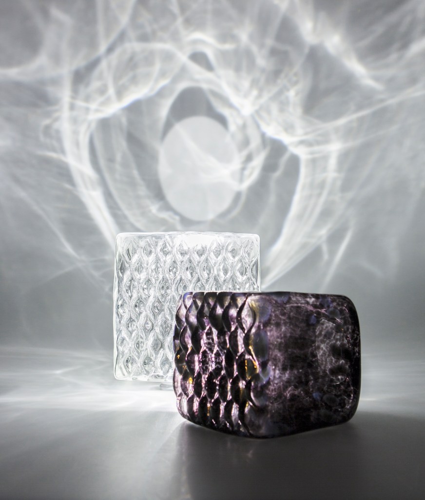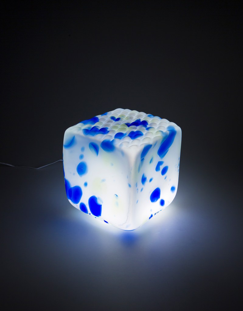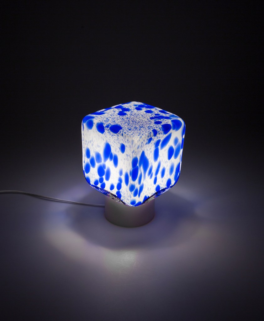 In geometry, a cube is a three-dimensional solid object bounded by six square faces, facets or sides, with three meeting at each vertex. Würfel mouth blown glass luminaire series get it’s inspiration from this geometrical shape.
